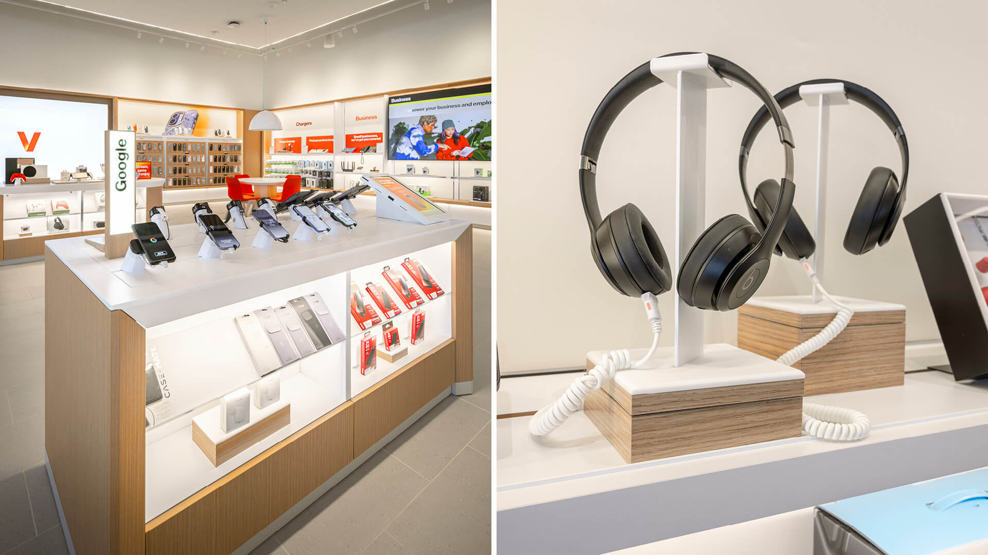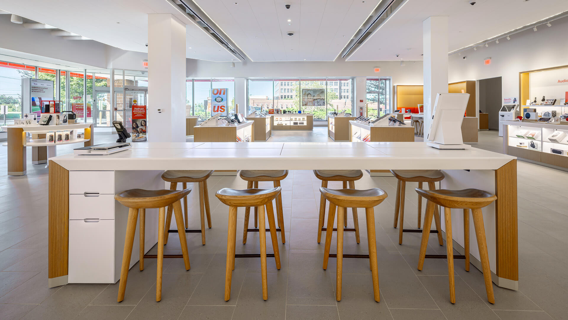 Located near HQ, this Verizon store is a live environment where executives review merchandising strategies, device launches, and fixture innovations. Developed in partnership with Triad, the design features wood-toned fixtures, sleek solid surface countertops, integrated lighting and tech, and comfortable upholstered seating—making it both a retail destination and a working innovation lab. This innovative fixture package is the result of a long-standing collaboration between Verizon and Triad.